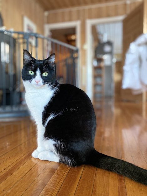 Hun er ganske redd av seg, både for mennesker og andre katter. Har et hakk i det ene øret.