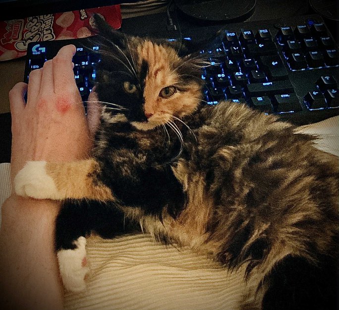 Veldig distinktivt ansikt. Halv lys farget halv mørk farget. Cappuccino er et år gammel og veldig menneske sky.