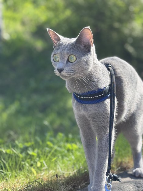Hun har sølvgrå pels, grønne øyne som er gule helt ytterst. Hun er ganske slank, rundt 3 kg.