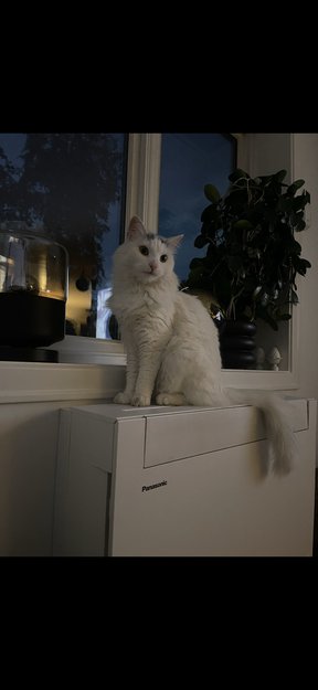 Hun er en lang håret katt og er hvit og grå på hodet. Hun er veldig vennlig og er glad i kos. Hun er en katt som mjauer mye