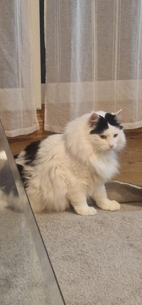 🔹 Utseende: Svart og hvit, langhåret og stor hannkatt