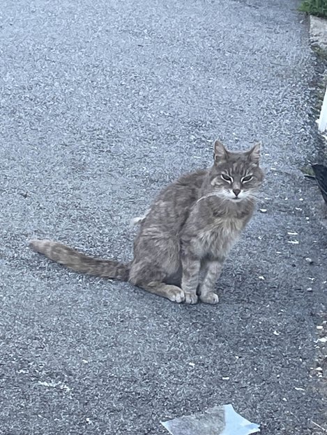 Veldig tynn hunkatt som kommer bort og leiter etter mat i søplå.