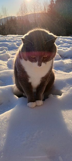 Hvit fra haken og nedover, og hvit på tuppen av potene, ellers for det meste grått. Liker ikke andre katter, men veldig kosete med mennesker.