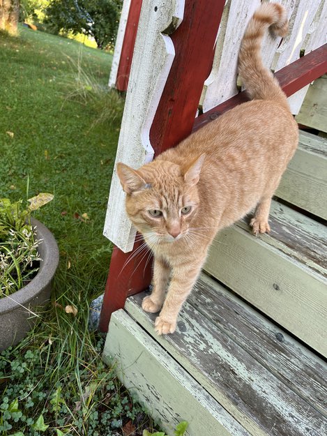 Han er hvit på brystet. Stor og fin oransje katt. Han er sky men pratsom. Han bor ved golfbanen og har vært sett av golfere.