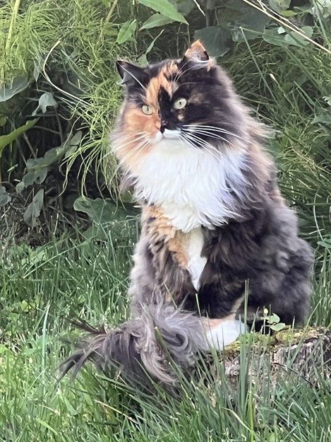 4 år gammel lodden tricolor hunnkatt, kraftig hale. Er skeptisk overfor fremmede og blir lett skremt.