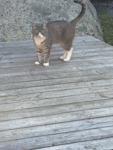 Der er katt som har oppholdt seg og fått mat av en eldre dame, men nå har hun flyttet og vi er ikke her så ofte, gjerne flere måneder imellom. Den er veldi kjelen, så vi går utifrå at den har et hjem, men den har vært jevnlig hos damen i to år.