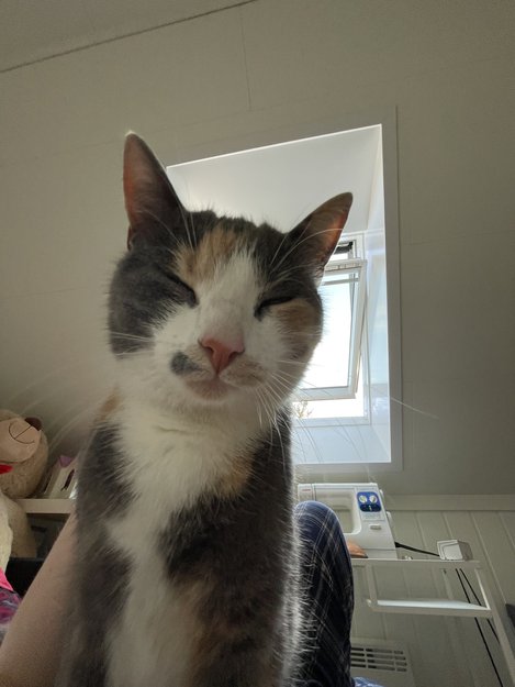hun er for det meste grå bortsett fra en liten oransj bit på ryggen, potene og ansiktet og ned til magen. hun har en grå «monroe» prikk over munnen. hun er ganske redd for mennesker og andre dyr men når hun har møtt deg er hun kjempe kosete og snill. hun mjauer veldig mye, hun pleier å gjøre det når hun ikke finner meg