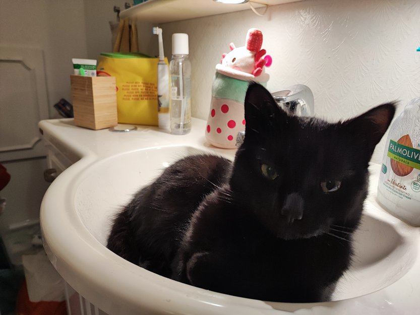 Nugatti er litt sky, men kosete. Noen hvite hårstrå, blandt annet på brystet.