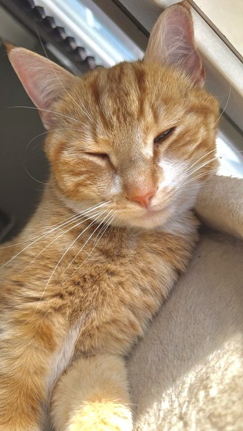 Orange med hvite poter/labber og hvit rundt munnen med litt orange