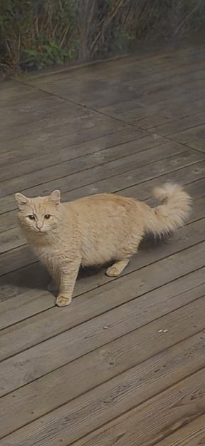 Orange/ Hvit stripete trolig hannkatt. Lang hale med litt bustete langt hår. Ellers trolig ukastrert.