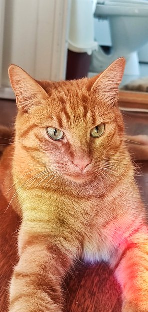 Han er oransje med kort pels. Han er bare halvannet år gammel. Han har seks tåputer, stripete med skråstilte øyne, tynn og lang overkropp, lange ører og grønne øyne. Han har fregner på nesen og i munnen. Han har en hvit bart. Han liker veldig godt å kommunisere med folk, men er redd for små barn. Han kan snakke, men gjør det ikke ofte. Han går bare bort til folk og begynner å gni seg mot dem eller leke. Han er heller ikke redd for hunder eller noe generelt. Han begynner bare å leke med dem. Han liker å være jeger og jakter på fugler, gresstrå og alt som beveger seg.