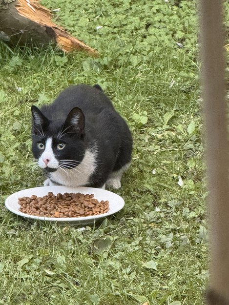 Veldig sulten katt kommer til oss hver dag. Virker tam men er veldig redd.