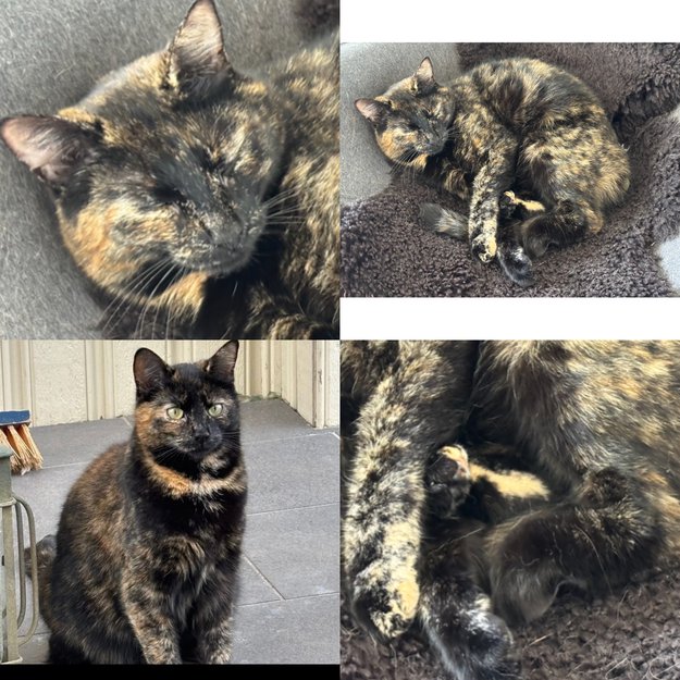 Stor hunnkatt. 6 kg. Grønne øyne. Rødstripet på kinnet. Tricolor med sort og gul/rødstripet pels.