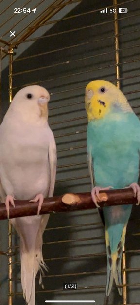 Coco er hvit og tiki er blå og gul og har svarte prikker på seg