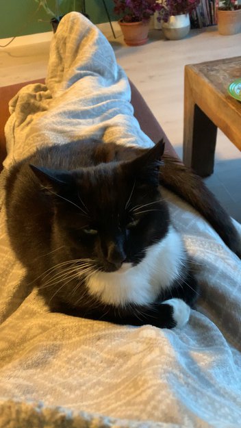 Kutt i venstre øre, hvite værhår. Og hvit opp mot nesa på den ene siden.