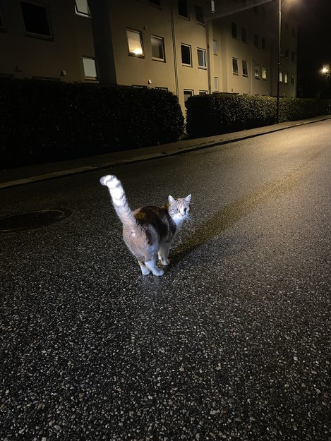 Funnet ute om natten mjauende over flere timer ved en av boligblokkene i nærheten. Veldig tam (lar seg bla. Løftes opp), fin og stelt i pelsen, samt at hun virker ikke mager. Mulig bortkommen og finner ikke veien hjem?