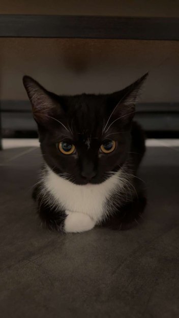 Den er svart men hvit på magen. Den har brune føflekker under potene sine. Veldig redd katt og liten.
