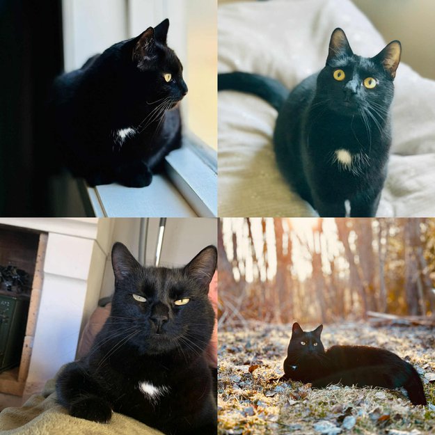 Hun kan være ganske sky mot fremmede, men er veldig kosete og god mot oss her hjemme - hun er høyt savnet! Hun er svart, med en hvit flekk på brystet. Sterilisert hunnkatt, 5 år, 4-5 kg.