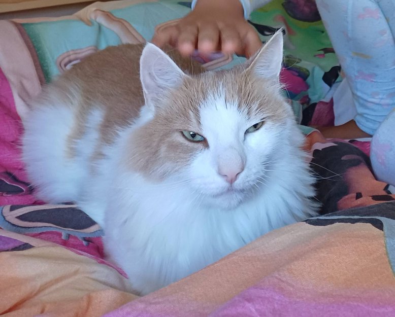 Buster er en langhåret skogskatt, med oransje og hvit pels.