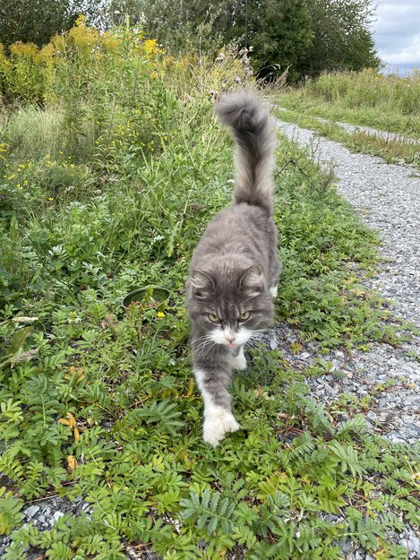 Den følger etter folk hele tiden å mjauer. Den er avmagret, har selv hund og hver gang jeg lufter hunden så kommer den etter oss. Er veldig glad i dyr og dette er ikke en god opplevelse. Den er grå og hvit og har litt spesielle poter foran. Kan se ut som potene mangler en klo.