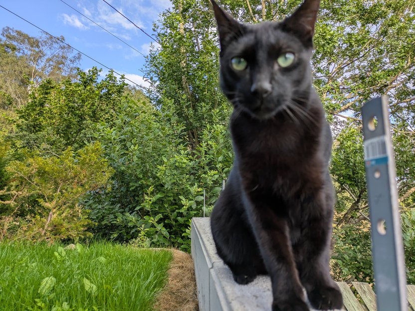 En svart katt med brune striper som blir synlige i lyset. Han har grønne øyne, er litt større enn vanlige katter og veldig snill.