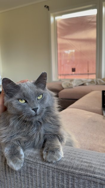 Han er over fem år, stor katt, lang grå pels, veldig vennlig og stille og ett lyst mjau.