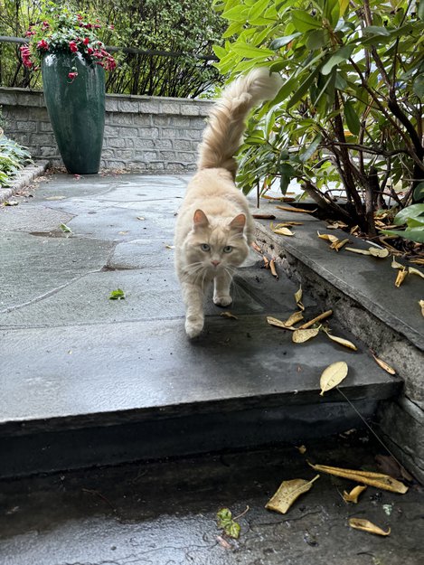 Katten har vært i området lenge, og bor sannsynlig i nærheten. Den begynte å komme inn på eiendommen vår noen ganger i sommer og lete etter kattemat, siden vi har to katter selv.