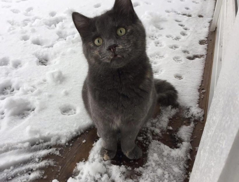 Hun har to lyse flekker på hvert fremben. Lys sokk på høyre bakben. Ellers spettete lyse flekker i pelsen. Men ser bare grå ut om du ser henne på kvelden. Veldig sky og redd😢