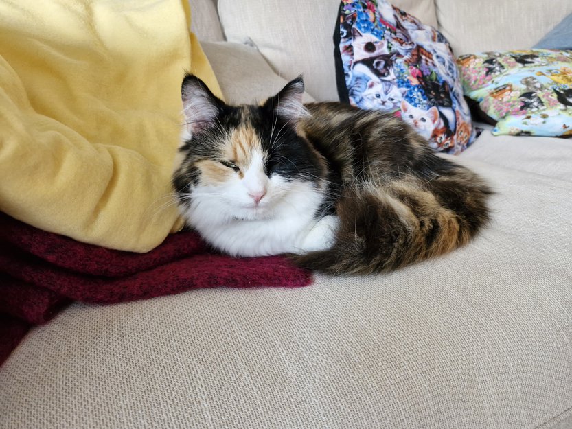 Hun er glad i mennesker og kjennetegnes ved sin store buskete hale og et rosa mønstret halsbånd