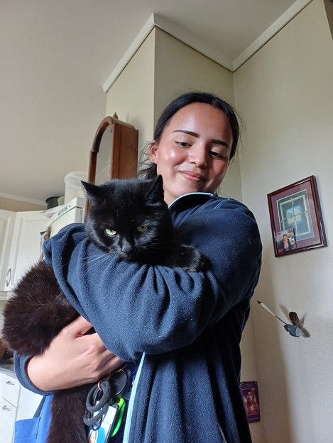 Sofia er helt sort, uten om 10 -12 hvite hår på brøstet. Ikke no kose katt, kun når hun vil. Er litt sky, så det er ikke så mange hun frivillig går til