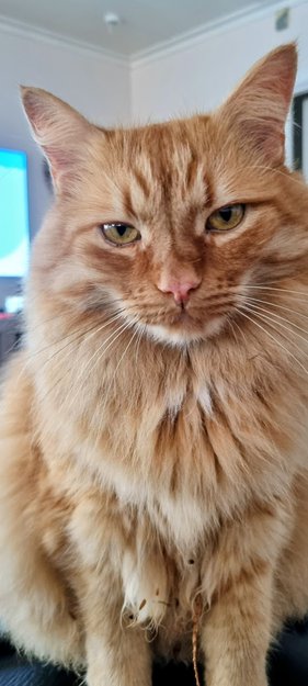 Relativt stor hannkatt. Snill og rolig. Orange over hele kroppen. Stor fluffy hale. Ganske nylig klippet kortere på bakre del av kroppen.