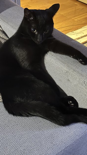 Liten og slank svart hannkatt. Ingen spesielle kjennetegn i form av lyse hår i pelsen.
