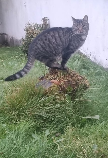 Jeg har sett denne katten jevnlig gjennom sommeren. I motsetning til nabokatter som vandrer gjennom hagen er denne veldig sky. Katten løper umiddelbart om den oppdager at jeg ser den fra lang avstand. Enkelte andre ting gjør at jeg mistenker at det er mulig den ikke har et hjem eller har forvillet seg hjemmefra. Det er mulig den bare veldig sky for fremmede, men må forsikre meg om at katten har et hjem og kjenner den igjen.