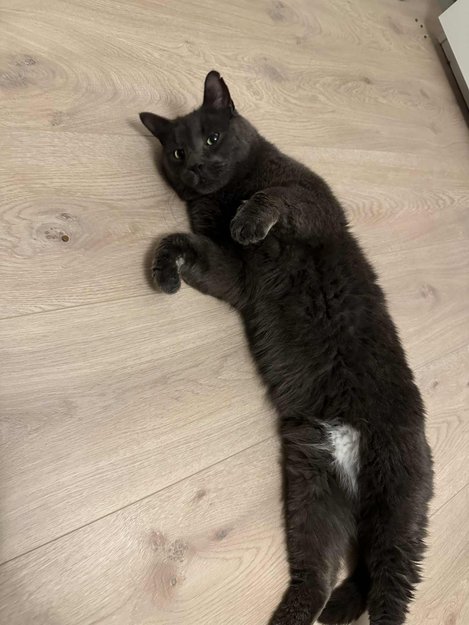 Katten er svart med litt hvitt på magen. Har et lite hakk i venstre øre.