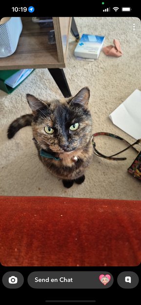 Brun, svart og beige-farget svært sosial og kjælen hunnkatt. Veldig glad i mennesker, oppsøker særlig voksne mennesker for å få kos. Veldig mye pels, svart og brun og beige oppå, med beige underpels. Gul-grønne øyne, beige hake. Hadde på seg rød-oransj halsbånd med blå sløyfe og bjelle da ho gikk ut sist, men den kan ha falt av.