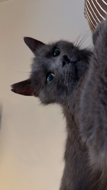 Han er nylig blitt diagnostisert med hypertyreose (høyt stoffskifte), så han er litt liten og tynn (3,8kg). Pelsen er grå med en liten hvit flekk på halsen. Han har store, gule øyne. Det ene øret er delvis delt i to pga. tidligere konflikt med nabokatt.