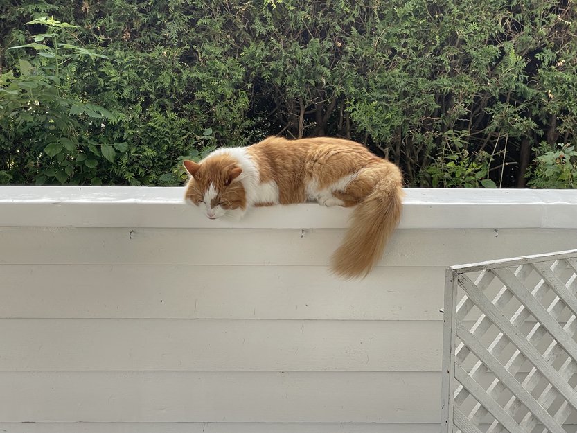 Brune og hvite "rene" pels partier. Stor busket hale, brun flekk under hake/øverste del av brystet. Han er sky, men samtidig nysgjerrig, og kan ha funnet en åpen dør, garasje eller bod.