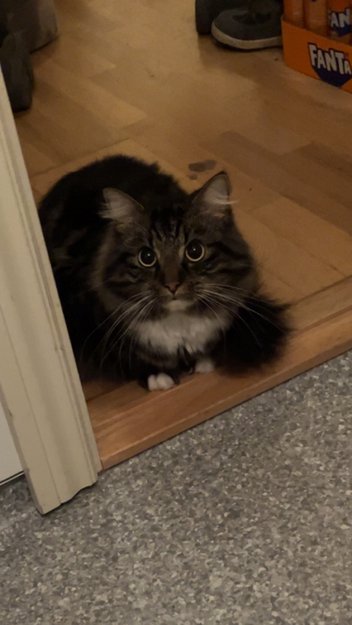 Innekatt, kommet seg ut takvinduet, satt fast på taket et døgn før brannvesenet bisto i å få han ned. Løp av gårde livredd, ikke blitt observert siden. Har vært i nærområdet med felle en periode uten hell.
