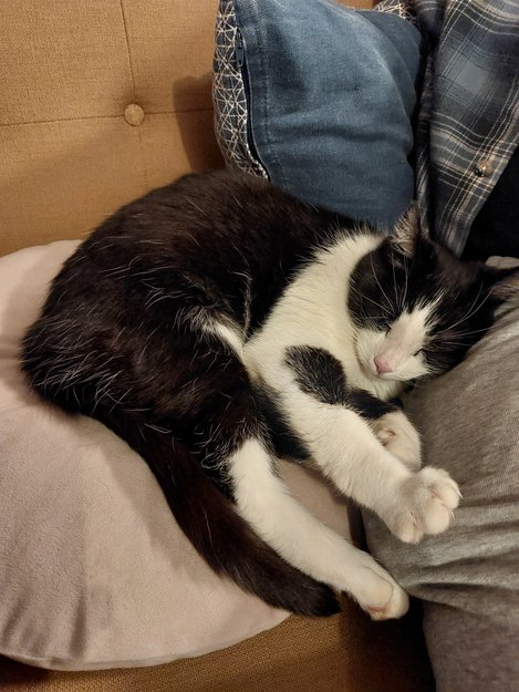 Svart og hvit katt funnet på søndagstur i dag. Veldig kosete og kontaktsøkende, fulgte etter oss i flere kilometer. Mjauet og var sliten og virka som den har gått seg skikkelig bort.