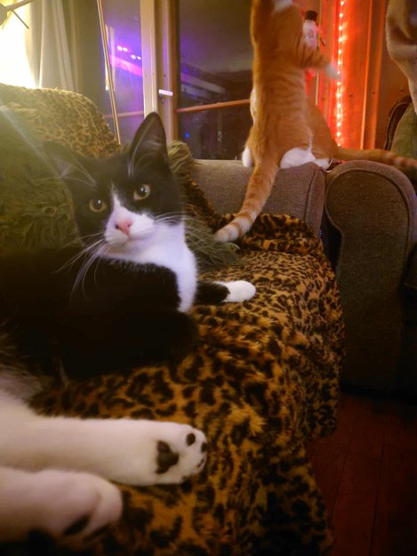 1 år gammel hannkatt med kort svart&hvit pels. Han er høy, lang og slank, veier 4kg.