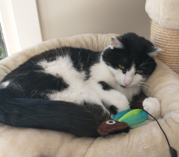 Hun er svart og hvit, men en liten svart merke under haka. Hun er nesten helt svart på ryggen, men har to hvite striper, en på nakken og en rundt livet. Hun har også en liten hvit sirkel på høyre lår. Hun er ID-chippet og har en liten merke/tatovering i øret.