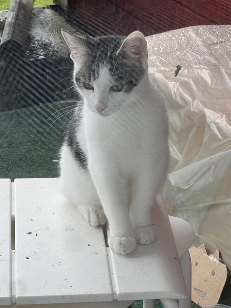 Natt til tirsdag 16 september 2025 fant vi en katt sittende på en krakk på balkongen vår. Den har mjauet og søkt kontakt med oss veldig mye siden i går natt og vi har dessverre ikke muligheten til å slippe han inn på grunn av allergi hos noen beboere i enheten. I dag morges ser jeg den fortsatt ute i balkongen og søke ly under tingene ute. Jeg gikk ut for å gi tunfisk og vann. Han spiste ikke. Men søkte bare kontakt og kos fra meg og fortsatte å kommunisere at den ville inn. Han går frem og tilbake mellom vår balkong og nabobalkongen. Jeg tror ikke de eier han. Og jeg lurer på om vi er så høyt oppe at han ikke kommer seg ned? Vi er i tredje etasje. Mens han var borte noen runder, så lagde jeg et lite hus av papp for at den skal søke ly, lagde kattedo for han og satt ute vann og litt trygge leker for katter. Men jeg vet egentlig ikke om han er gått seg bort, ikke blir sluppet inn av eierne, at han sitter fast i en høyde eller om han bare søker oppmerksomhet fra oss. Han mjauer veldig mye etter oss. Og det gjør vondt å ikke slippe den inn, men vi har dessverre ikke muligheten pluss at alle skal på jobb osv. Jeg finner ikke chip eller bånd eller noen ting og vet ikke hvordan jeg skal finne eieren. Men jeg legger ved bilder. Og håper jeg får lære mer om
