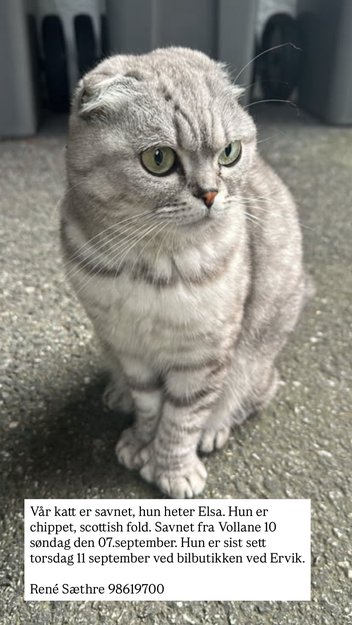 Elsa har vært borte i 1.5 uke nå, sist sett i Ervik for en ukes tid siden. Veldig kosete og spesiell katt med ørene som går ned.