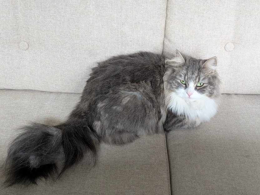 Ung langhåret grå hunnkatt dukket plutselig opp hjemme hos oss. Den var tynn, rufsete og sulten. Katten er ikke chippet.