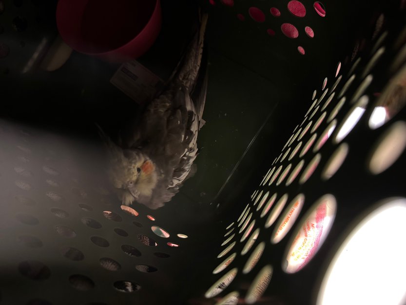 Fuglen ble jaget av andre fugler, klamret seg til vindu. Fikk den inn og den passes nå på. Tror det er en Nymfeparakitt/Nymfekakadu.