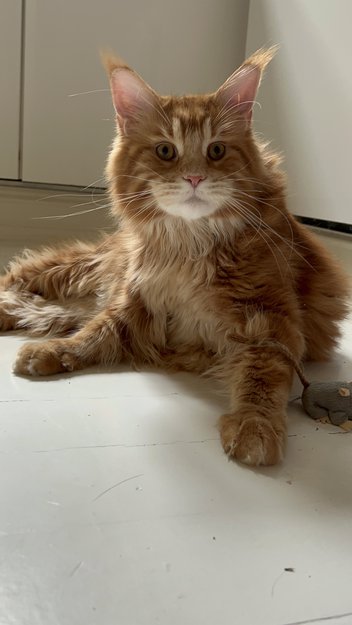 Han er en langhåret orange main coon. Han er hvit rundt munnen, litt beige hvit på magen og halsen og har tuppen av halen er hvit.