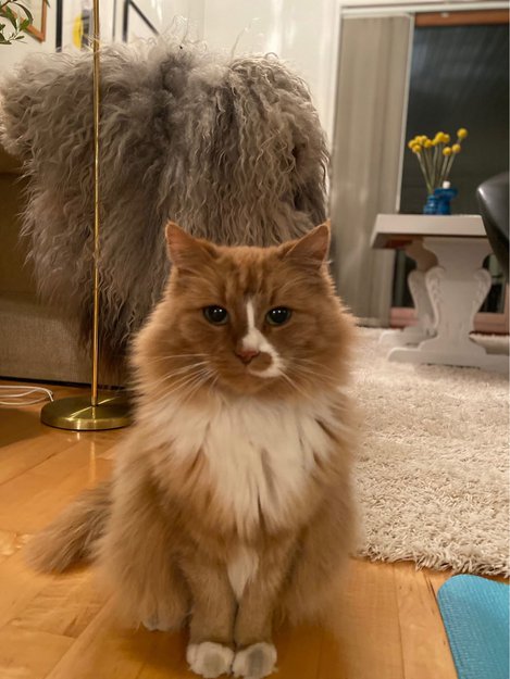 Hun hører hjemme i Godliaveien. Hun er oransje/hvit og langhåret, med et skjevt hvitt bless på snuten.