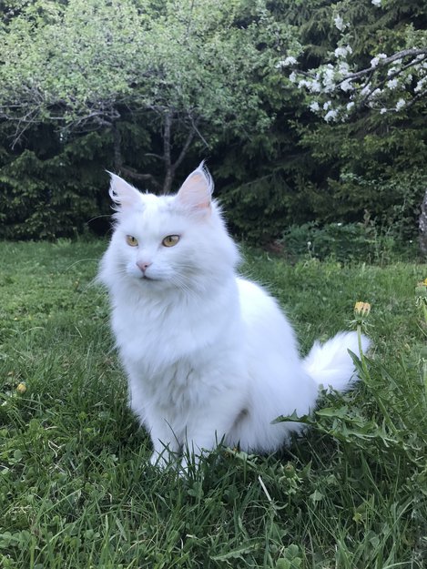 Luna er hvit med litt svakt grått på toppen av hodet.