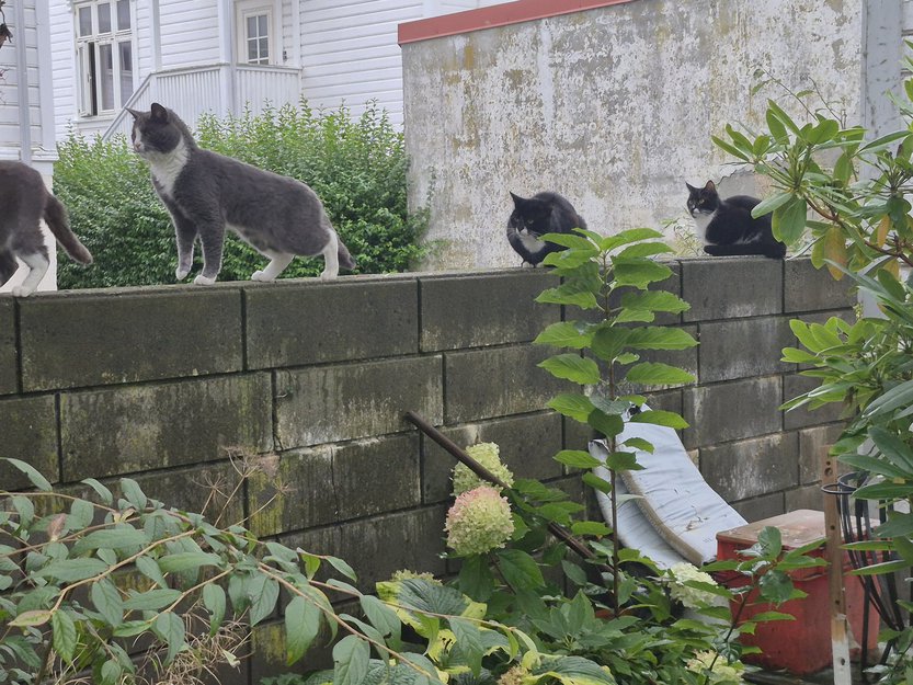 Fire katter har oppholdt seg i hagen vår ettermiddag og natt i flere dager. En del mjauing/lyd på natten. Kan se ut som en voksen og tre ungkatter. De har ikke halsbånd. Holder noen meters avstand til mennesker, så ikke enkelt å sjekke om de er merket.