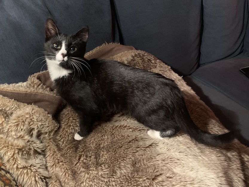Liten kattunge jente, veldig tam, maler lett. Hvite «sokker» mens selve potene er svarte. Litt hvite flekker i fjes, men svart snute. Hvitt rundt halsen.